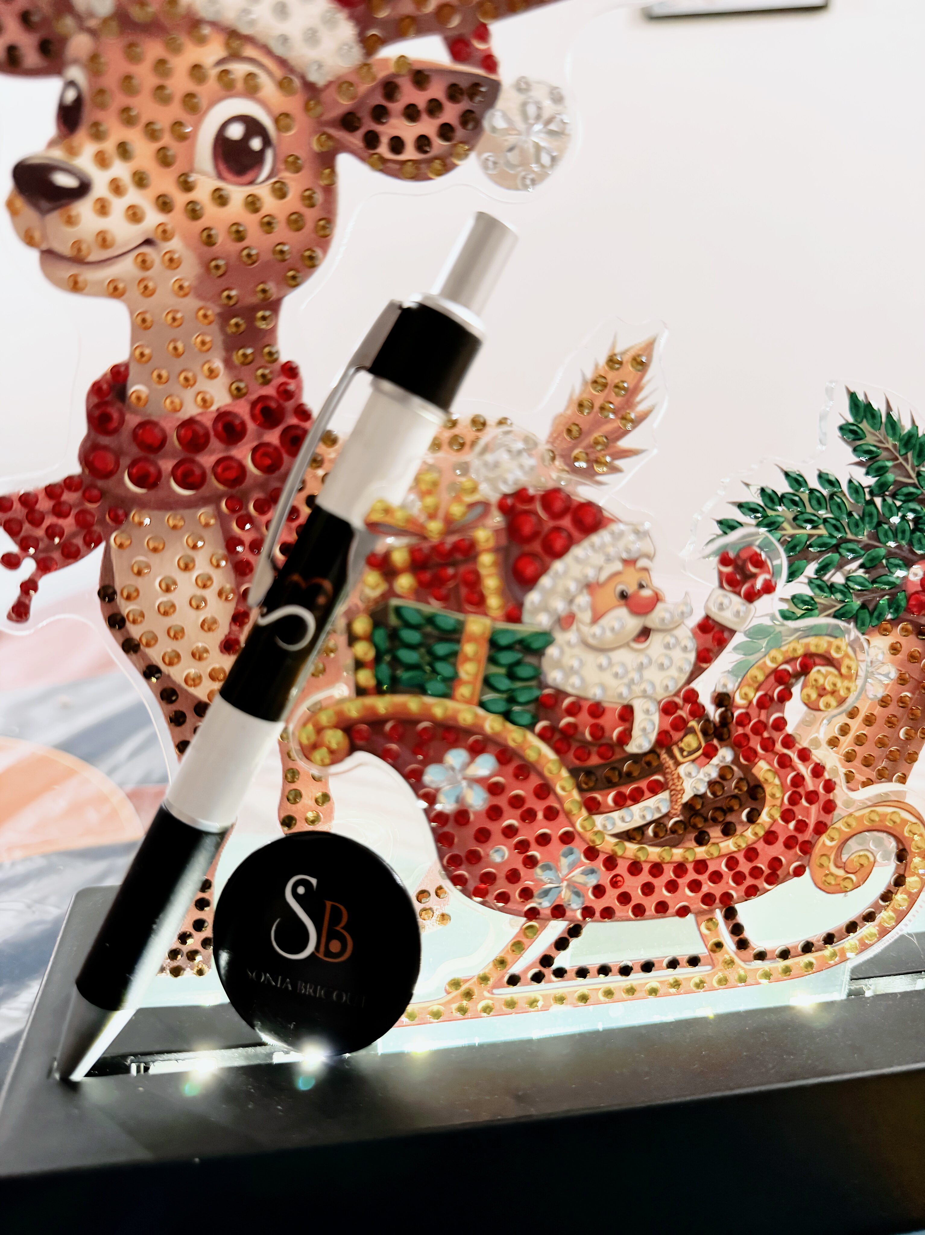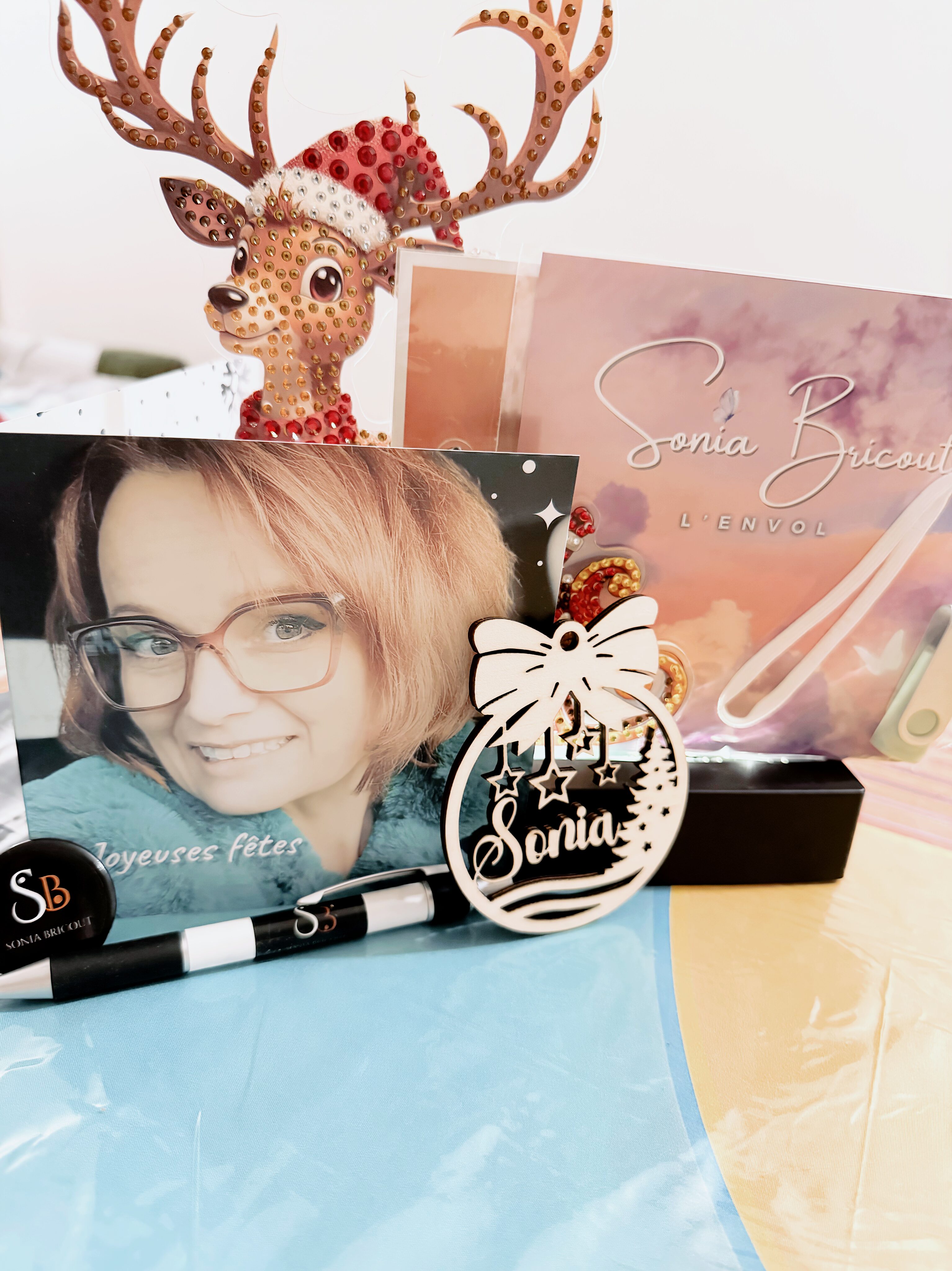 Une carte de Noël dédicacée, un stylo Sonia Bricout, 1 badge Sonia Sonia Bricout, et une boule de Noël en bois Sonia + 1 clé USB « Renaissance » + 1 clé USB L’envol